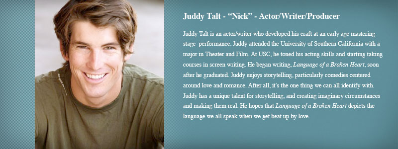 Juddy Talt is an actor/writer who developed his craft at an early age mastering stage performance. Juddy attended the University of Southern California with a major in Theater and Film. At USC, he toned his acting skills and starting taking courses in screen writing. He began writing, Language of a Broken Heart, soon after he graduated. Juddy enjoys storytelling, particularly comedies centered around love and romance. After all, it’s the one thing we can all identify with. Juddy has a unique talent for storytelling, and creating imaginary circumstances and making them real. He hopes that Language of a Broken Heart depicts the language we all speak when we get beat up by love.