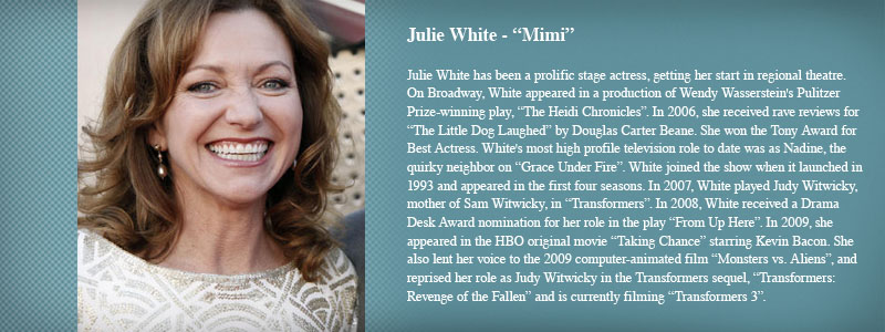 Julie White has been a prolific stage actress, getting her start in regional theatre. On Broadway, White appeared in a production of Wendy Wasserstein's Pulitzer Prize-winning play, “The Heidi Chronicles”. In 2006, she received rave reviews for “The Little Dog Laughed” by Douglas Carter Beane. She won the Tony Award for Best Actress. White's most high profile television role to date was as Nadine, the quirky neighbor on “Grace Under Fire”. White joined the show when it launched in 1993 and appeared in the first four seasons. In 2007, White played Judy Witwicky, mother of Sam Witwicky, in “Transformers”. In 2008, White received a Drama Desk Award nomination for her role in the play “From Up Here”. In 2009, she appeared in the HBO original movie “Taking Chance” starring Kevin Bacon. She also lent her voice to the 2009 computer-animated film “Monsters vs. Aliens”, and reprised her role as Judy Witwicky in the Transformers sequel, “Transformers: Revenge of the Fallen” and is currently filming “Transformers 3”.