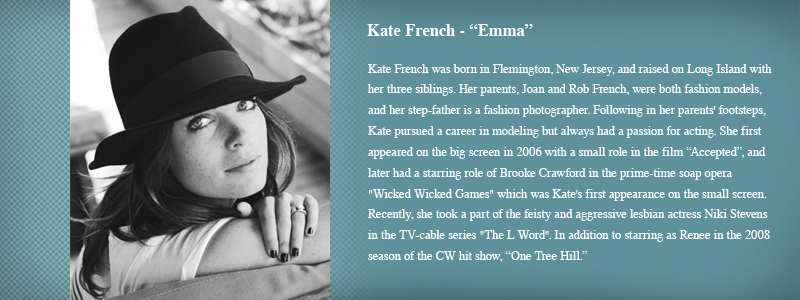 Kate French was born in Flemington, New Jersey, and raised on Long Island with her three siblings. Her parents, Joan and Rob French, were both fashion models, and her step-father is a fashion photographer. Following in her parents' footsteps, Kate pursued a career in modeling but always had a passion for acting. She first appeared on the big screen in 2006 with a small role in the film “Accepted”, and later had a starring role of Brooke Crawford in the prime-time soap opera "Wicked Wicked Games" which was Kate's first appearance on the small screen. Recently, she took a part of the feisty and aggressive lesbian actress Niki Stevens in the TV-cable series "The L Word". In addition to starring as Renee in the 2008 season of the CW hit show, “One Tree Hill.”